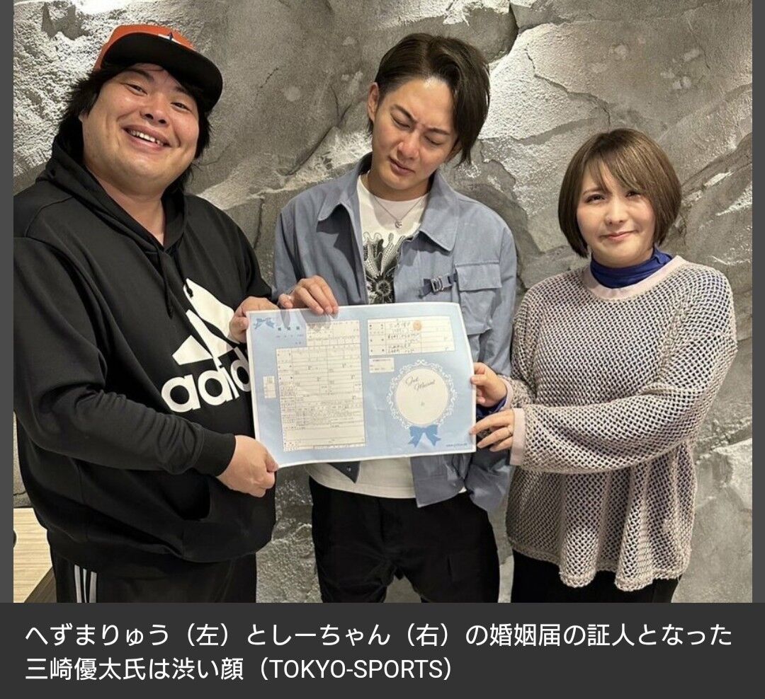 婚約発表から1年、破局危機を乗り越え、最後は「Repezen Foxx」(レペゼンフォックス)のDJ社長(30)と〝青汁王子〟こと起業家の三崎優太氏(33)が証人になってゴールを決めた。へずまは19日にしーちゃんと東京・豊島区役所に婚姻届を提出し、晴れて夫婦となった。