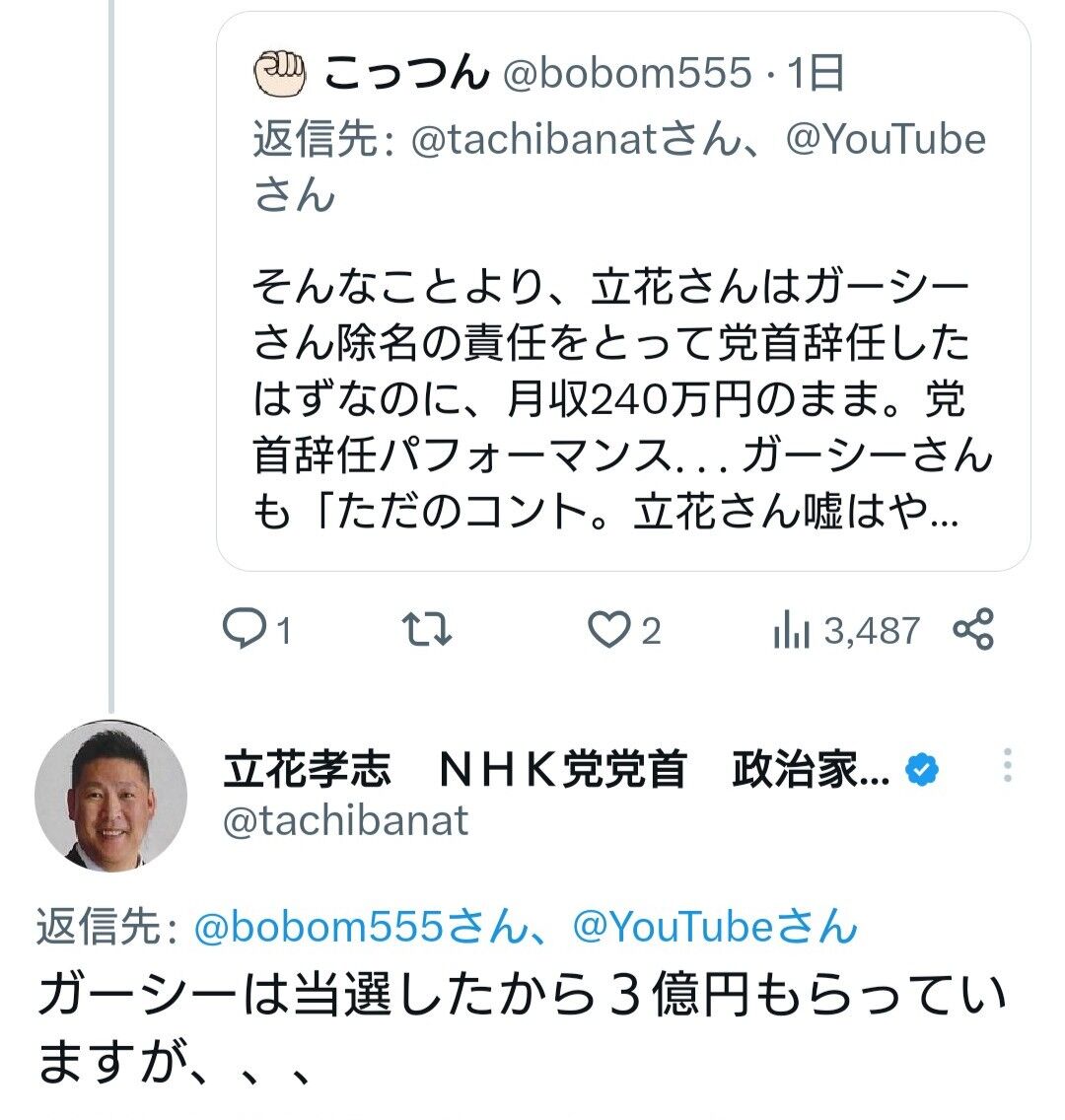 ガーシー、当選したらN党から政党助成金の3億円を貰う約束で出馬していた! 立花氏も認める「ガーシーは当選したから3億もらってます」