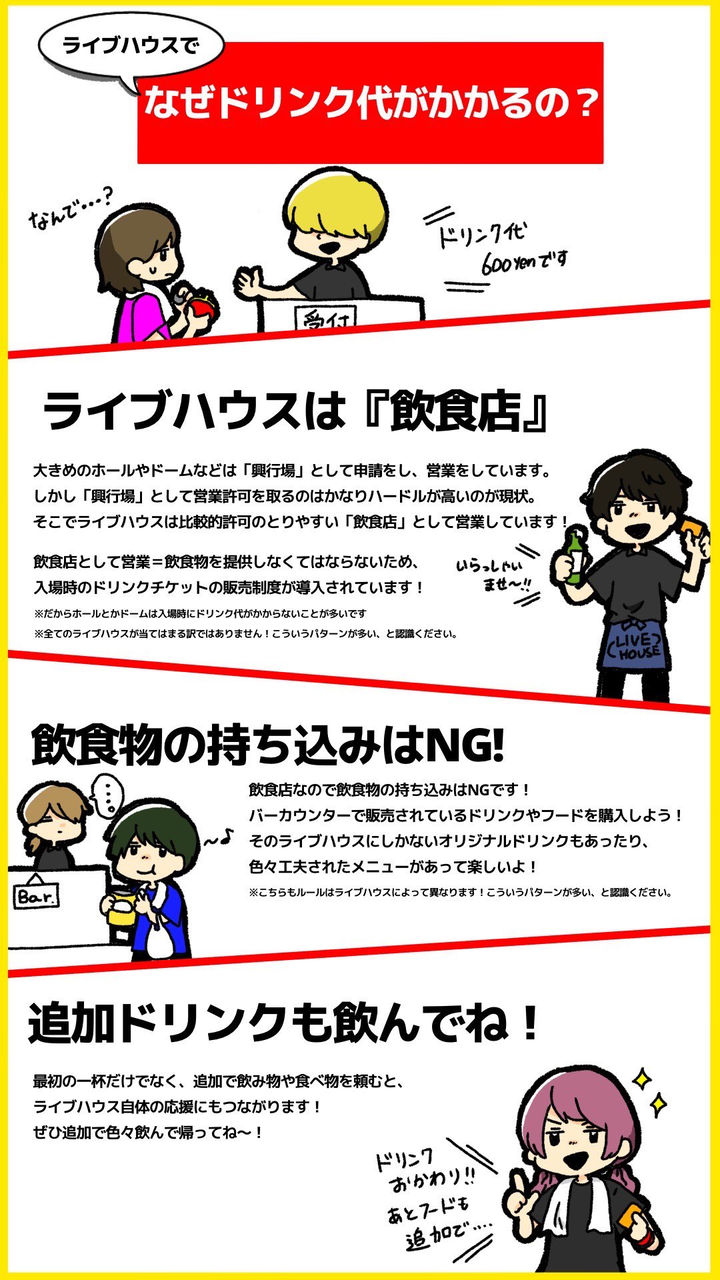 ただ、僕も画像にも注意事項として記載してるのですが、「こういうパターンが多い」というものを画像化しただけなので、全部のライブハウスがはてはまってるわけではないということも頭の片隅に入れておいてください!ただ、「追加でドリンクを頼んで欲しい!」という部分は全てのお店に当てはまってると思います。応援したいお店があればでいいので、そのお店に行った際はガンガンドリンクを頼んでください!