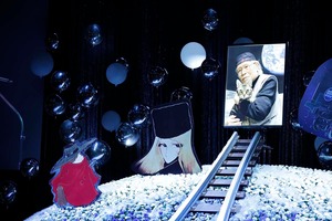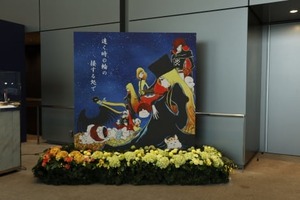 祭壇は「銀河鉄道999」をイメージ。松本さんが愛猫を抱く写真が、鉄郎とメーテルに見守られ、銀河鉄道999号に乗って地球から宇宙に飛び立つシーンが花祭壇で表現された。スプレーマム1700本、カーネーション5900本を含む系16000本の花が使われた。
