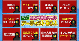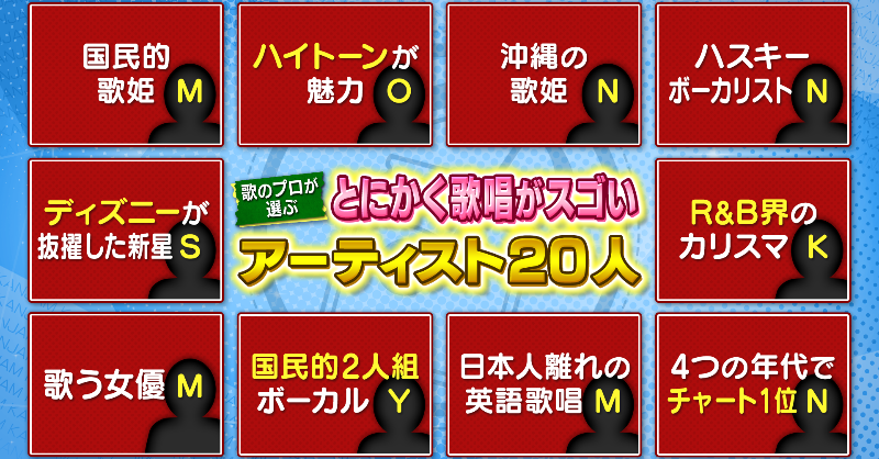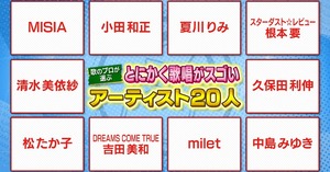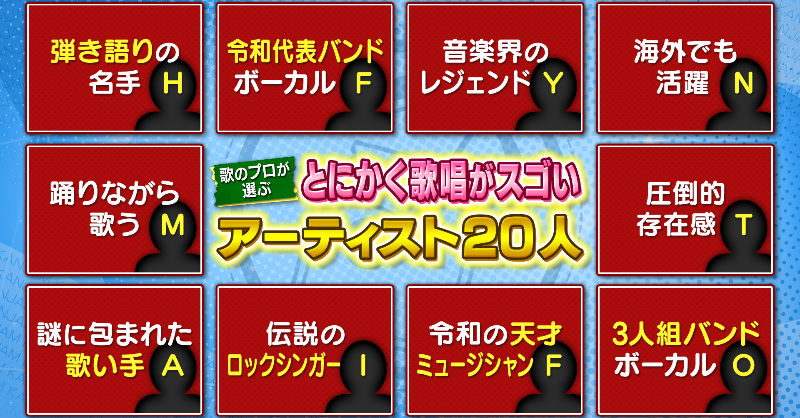 「歌のプロが選ぶとにかく歌唱がスゴいアーティスト20人」では、岡野昭仁(ポルノグラフィティ)、ゴスペラーズ、小渕健太郎(コブクロ)、仲宗根泉(HY)、秦基博、吉岡聖恵(いきものがかり)など“一流アーティスト”とAdo、Awesome City Club、北村匠海(DISH//)、yamaなど“令和に活躍中の若手アーティスト”、総勢37人の歌のプロたちが「歌唱がスゴいと思うアーティスト」「特に好きな曲」を挙げ、票が多く集まった20人を厳選。