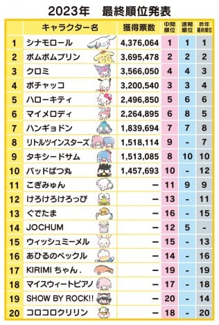 第1位のシナモロールは初日速報、中間発表ともに首位を守り続け、唯一400万票超えの圧倒的票数を集めた。第2位のポムポムプリンは9年連続となるトップ3入り。第3位は初日速報と中間発表はポチャッコが第3位だったが、最後にクロミが大逆転しトップ3に食い込んだ。
