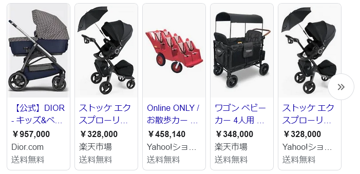 「超高級ベビーカーで検索するだけでこういった商品が出てくるので、8万円がいかに庶民向けなのかがわかるというもの。」