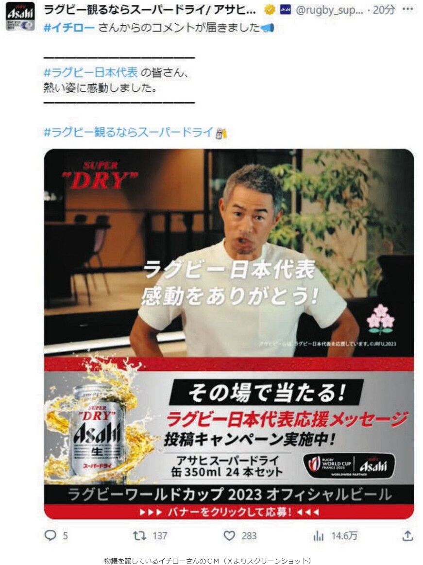ラグビーW杯フランス大会で8日、日本の敗退が決まった直後に流れたテレビCMにツッコミが殺到している。アサヒスーパードライのCMで米大リーグなどで活躍したイチローさん(49)が、負けを想定して準備されたような言葉を発しており、SNS上では「冷めたわ」「あまりにも失礼」などの声が上がった。