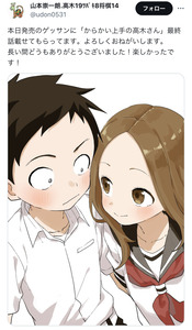 本日発売のゲッサンに「からかい上手の高木さん」最終話載せてもらってます。よろしくおねがいします。