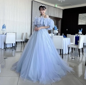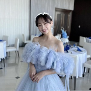 1~3枚目では爽やかなブルーの、4枚目以降では純白のウエディングドレスを着用した姿を披露しました。