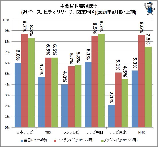↑ 主要局世帯視聴率(週ベース、ビデオリサーチ、関東地区)(2024年3月期・上期)テレビ東京は区分の上では在京キー局の5局に収められているが、他の4局と比べれば放送内容の特異性(比較的経済関連の内容が多い)の都合上、視聴率で他局と比べて低めの値が出るのは、ある意味やむを得ない。その特異性を考慮し順位精査の際に除外すると、日本テレビ・テレビ朝日・NHKが高め、TBSとフジテレビが低めと、2階層状態にある。