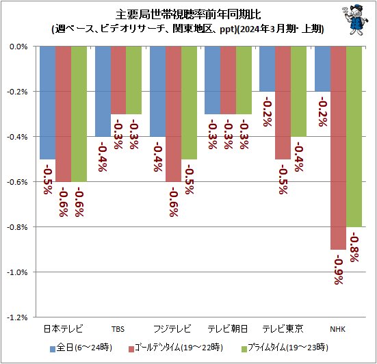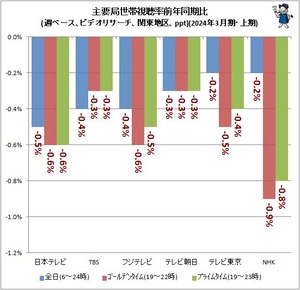 ↑ 主要局世帯視聴率前年同期比(週ベース、ビデオリサーチ、関東地区、ppt)(2024年3月期・上期)今期はNHKも含む全局が全時間区分においてマイナスとなり、視聴率が増加した局・時間区分は皆無となった。非常に珍しい現象だが、視聴率の低迷傾向はすべてのテレビ局で生じているもので、例えばNHKの業務報告書でも「テレビ放送全体での接触者率の低落傾向は変わらない」との言及があるほど。比較対象の2023年3月期・上期においても、その前年同期からは全局がマイナスを示しており、比較対象期がプラスだったので反動でマイナスになったとの理由付けはできない。