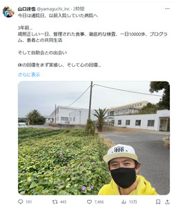 山口氏は「今日は通院日、以前入院していた病院へ」と、入院治療を受けていたアルコール依存症の専門病院を訪れた写真をアップ。「3年前… 規則正しい一日、管理された食事、徹底的な検査、一日10000歩、プログラム、患者との共同生活 そして自助会との出会い」と入院当時の生活について振り返った。