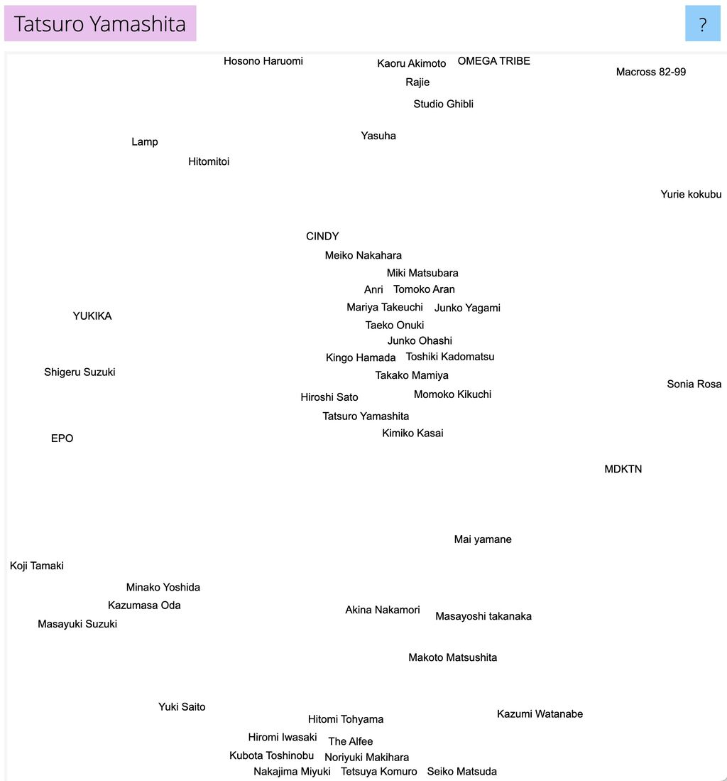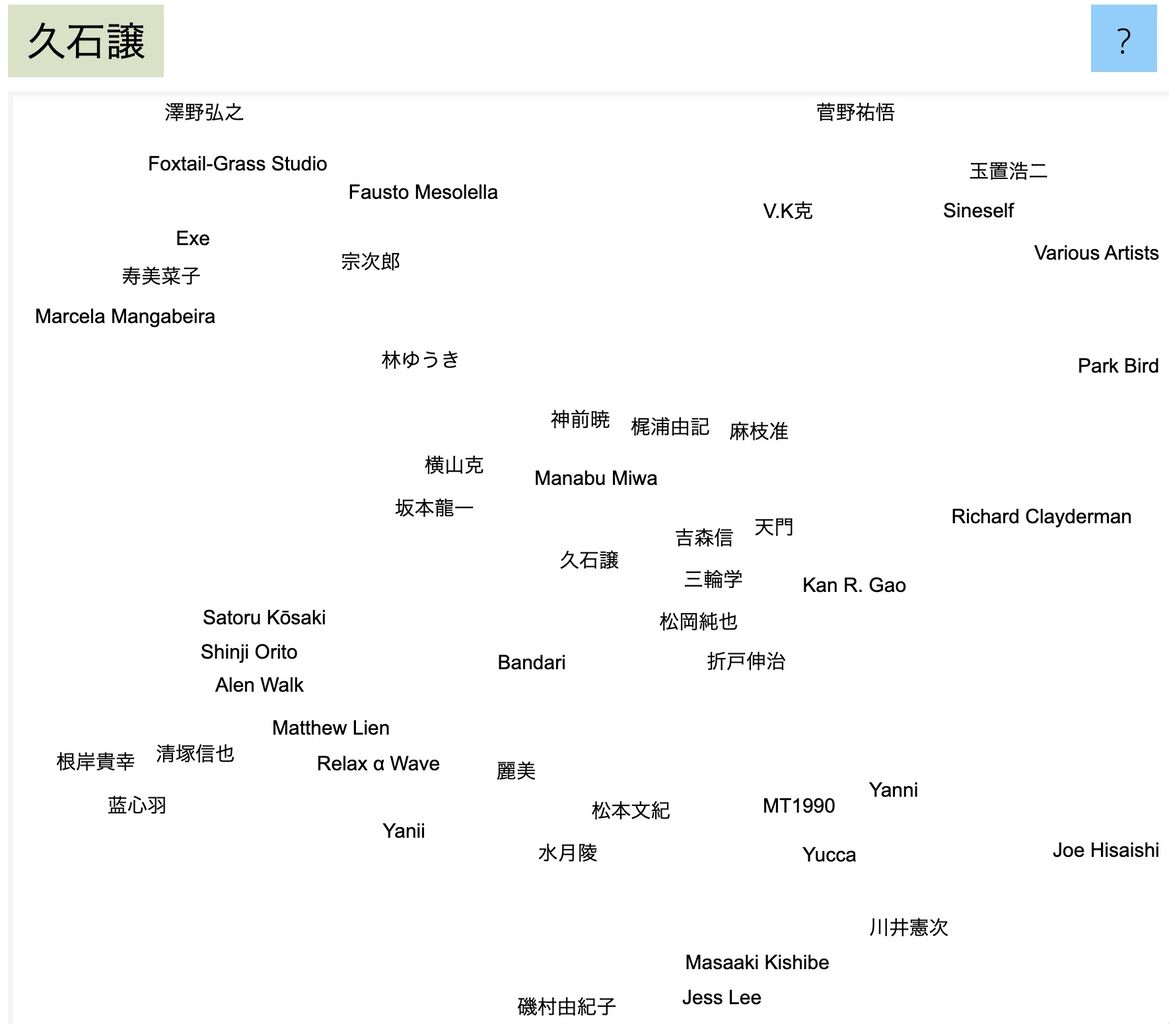 2023/12/11 19:17「このバンドやミュージシャンが好きなら、これらのバンドやミュージシャンも好きかもしれない」というのをAI(人工知能)が提案する音楽マップ「Music-Map」が話題に。マップ上、2つの名前が近ければ近いほど、両方のアーティストが好きである確率が高くなるという。これは、人工知能と新しいユーザーインターフェースの実験Gnod(Global Network of Discovery)の一環として作られたものです。