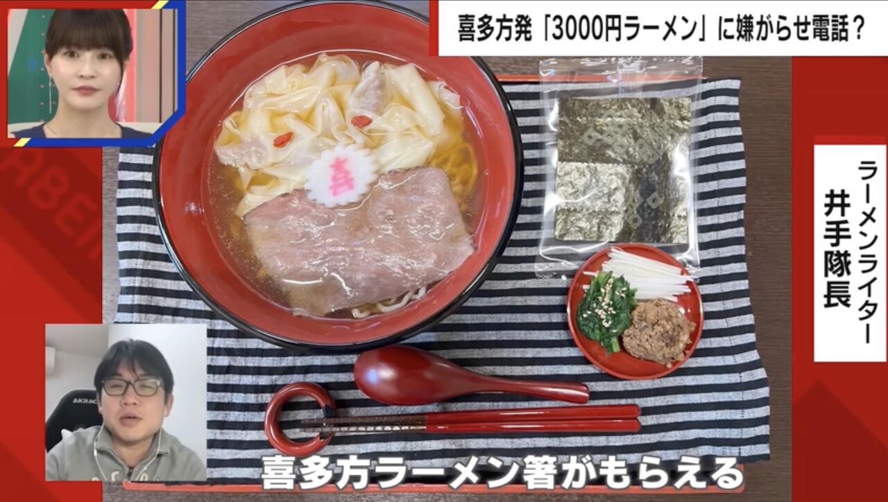 この話題について千原ジュニアは「分厚いブランド牛(のチャーシュー)が乗っていて、小鉢ついていてこの見た目。ほんでお箸も持って帰れて3000円。その内容をホンマにわかって苦情してはるのかな」と首を傾げていた。