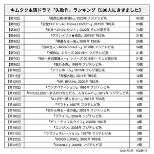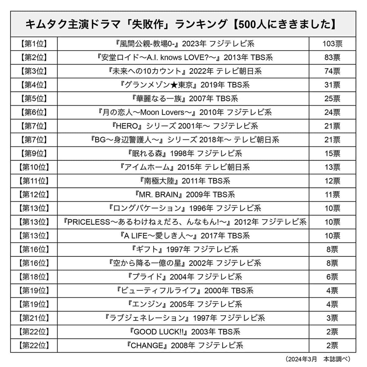 そこで本誌はアンケート調査を実施。全国のドラマ好きの30代から50代の女性500人に「木村拓哉の主演ドラマで『失敗作』だと思うのは?」をきいた。対象としたのは、木村主演の連続ドラマ23作品だ。