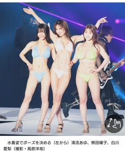 緑のビキニの白川、青の清流とともに熊田はステージ中央で肩を組み、身体をくねらせた。
