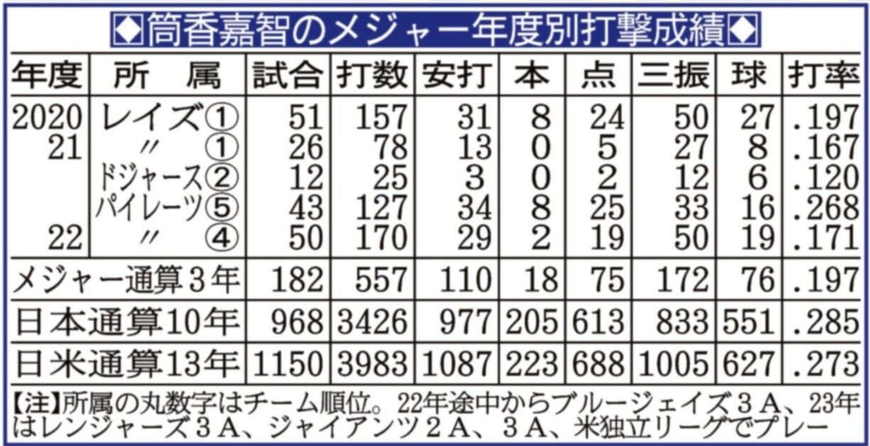 米大リーグ、ジャイアンツとマイナー契約を結んでいた筒香嘉智内野手(32)が21日(日本時間22日)、退団することが決まった。オプトアウト(契約破棄条項)を行使したもの。今後はフリーエージェント(FA)となり、日米の全球団を対象に所属球団を探す。