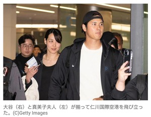 仁川国際空港にはスターを見送ろうとするファンで溢れかえり、多くの声援が飛び交った。一際注目が集まったのは昨季MVPの大谷翔平で、妻・真美子さんと仲良く並ぶようにロビーを通り過ぎた。