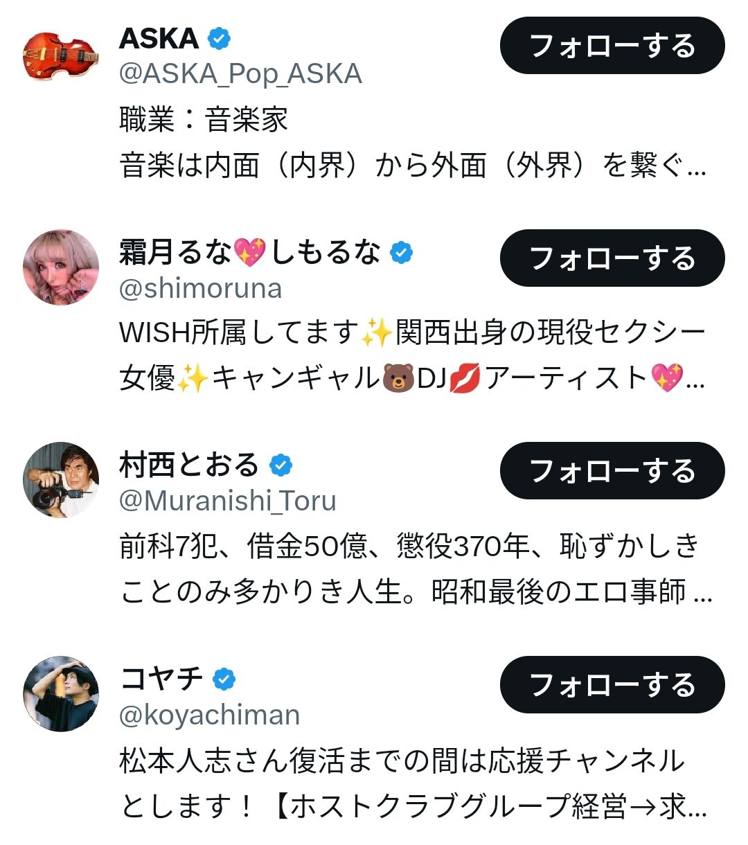 松本人志 Xで週刊文春報道に異論を唱え、自分を応援している4人(霜月るな、村西とおる、ASKA、競馬評論家)を新たにフォロー