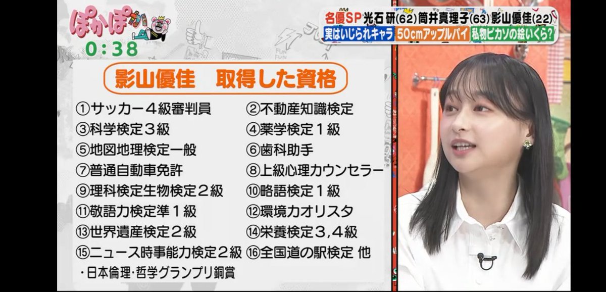 影山優佳が、25日放送の『ぽかぽか』(フジテレビ系)に出演。これまで取得してきた資格が一挙紹介された。