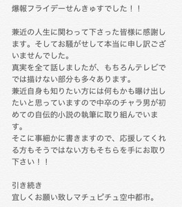 兼近は放送後、ツイッターを更新。視聴者への感謝を記した上で「真実を全て話しましたが、もちろんテレビでは描けない部分も多々あります。兼近自身も知りたい方には何もかも曝け出したいと思っていますので中卒のチャラ男が初めての自伝的小説の執筆に取り組んでいます」と伝えた。